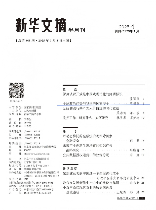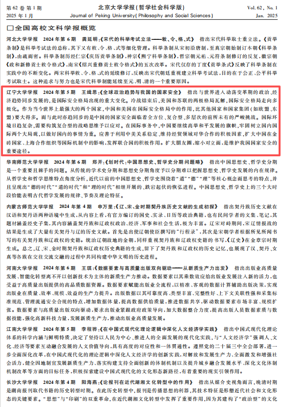 我校学报刊发学术成果再获权威认可。 2024年第5期《辽宁大学学报(哲学社会科学版)》刊发的王缉思教授的学术论文《全球政治趋势与我国的国家安全》,被《新华文摘》2025年第1期全文转载,且被《北京大学学报(学报概览)》2025年第1期论点摘编!